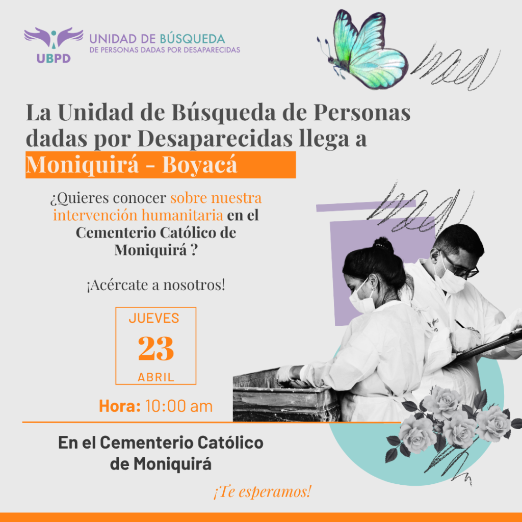 La Unidad de Búsqueda de Personas dadas por Desaparecidas (UBPD) informa a la comunidad que iniciará una intervención humanitaria y extrajudicial en el Cementerio Católico del municipio de Moniquirá, como parte de sus acciones para la búsqueda de personas dadas por desaparecidas en el departamento de Boyacá.