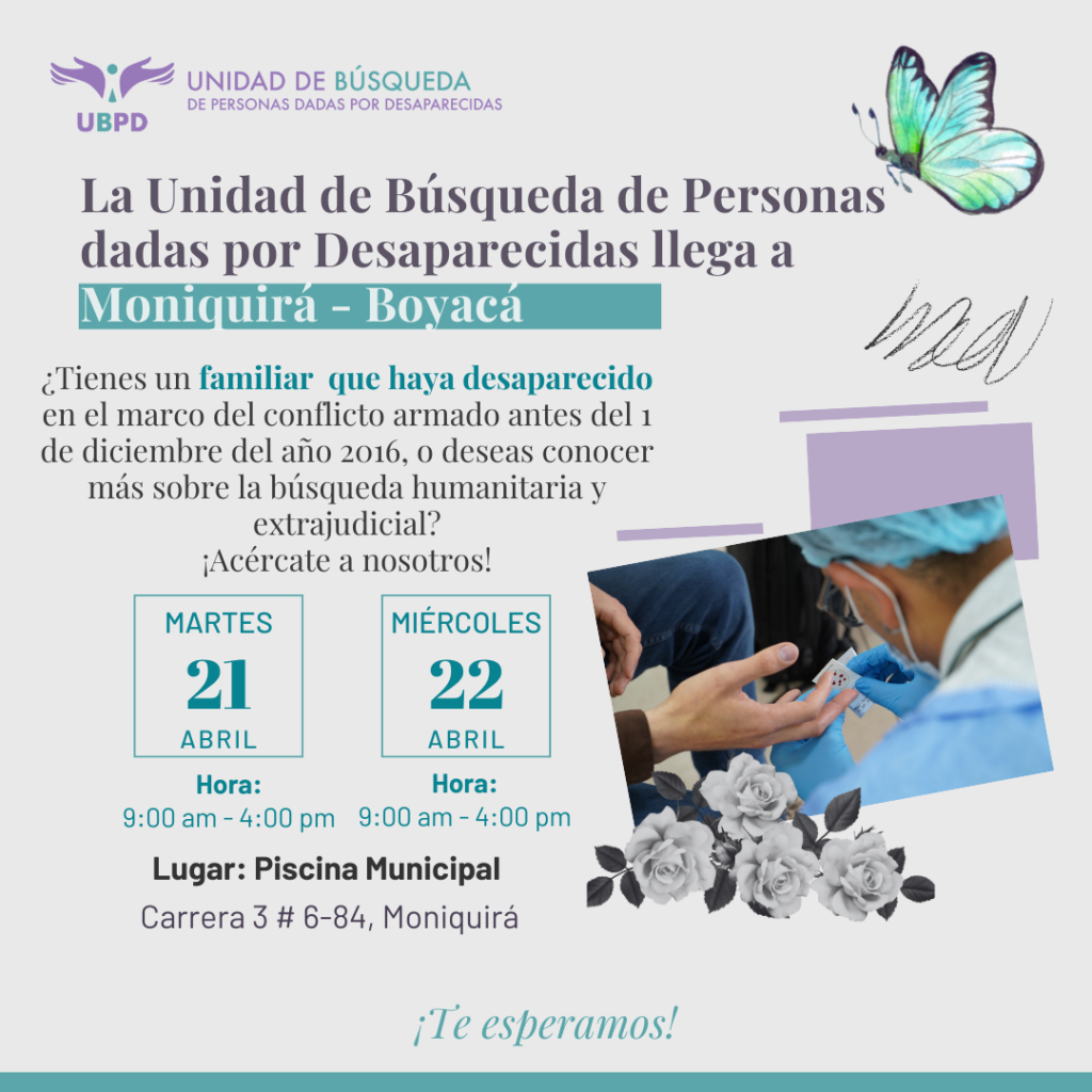 La Unidad de Búsqueda también desarrollará actividades de pedagogía, toma de muestras biológicas y recepción de solicitudes de búsqueda en Moniquirá entre el 21 y el 23 de abril. Estas actividades estarán abiertas a toda la ciudadanía y están orientadas a fortalecer la participación de las familias buscadoras, resolver las dudas de la comunidad sobre las intervenciones que se llevan a cabo y sensibilizar sobre la importancia del proceso de búsqueda.