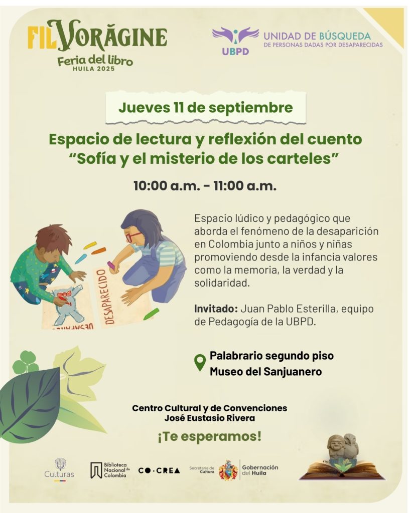 - Jueves 11 de septiembre: espacio lúdico y pedagógico con lectura del cuento ‘Sofía y el misterio de los carteles‘, dirigido a niñas y niños para sembrar desde la infancia los valores de memoria, verdad y solidaridad.