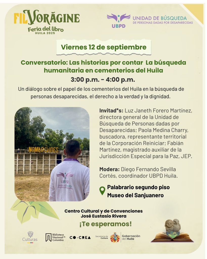 - Viernes 12 de septiembre: conversatorio ‘Historias por contar: la búsqueda humanitaria en cementerios del Huila’, con la participación de Luz Yaneth Forero Martínez, directora general de la UBPD, junto con liderazgos sociales e institucionales del departamento.
