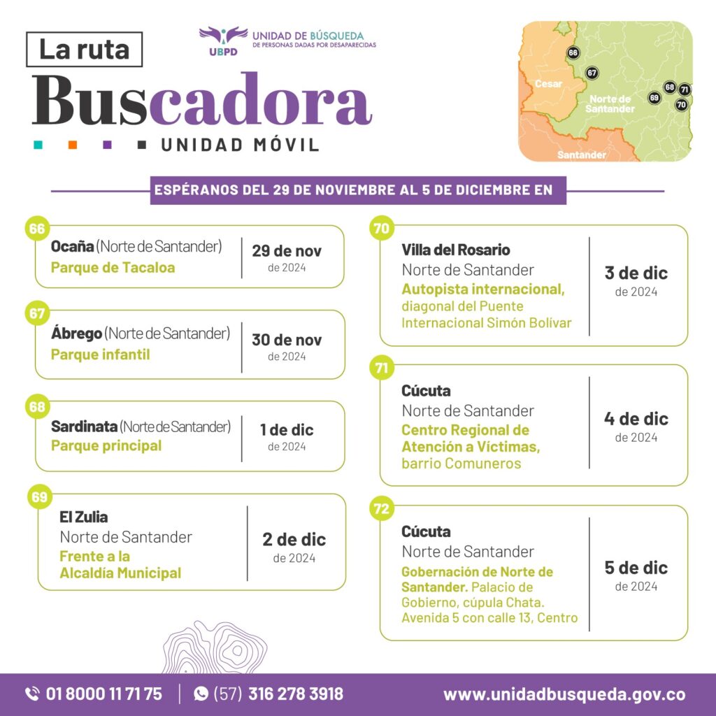San Alberto, en el Cesar; y Ocaña, Ábrego, Sardinata, El Zulia, Villa del Rosario y Cúcuta, en Norte de Santander, son los municipios que del 26 de noviembre al 5 de diciembre de 2024 visitará la unidad móvil La Ruta Buscadora.