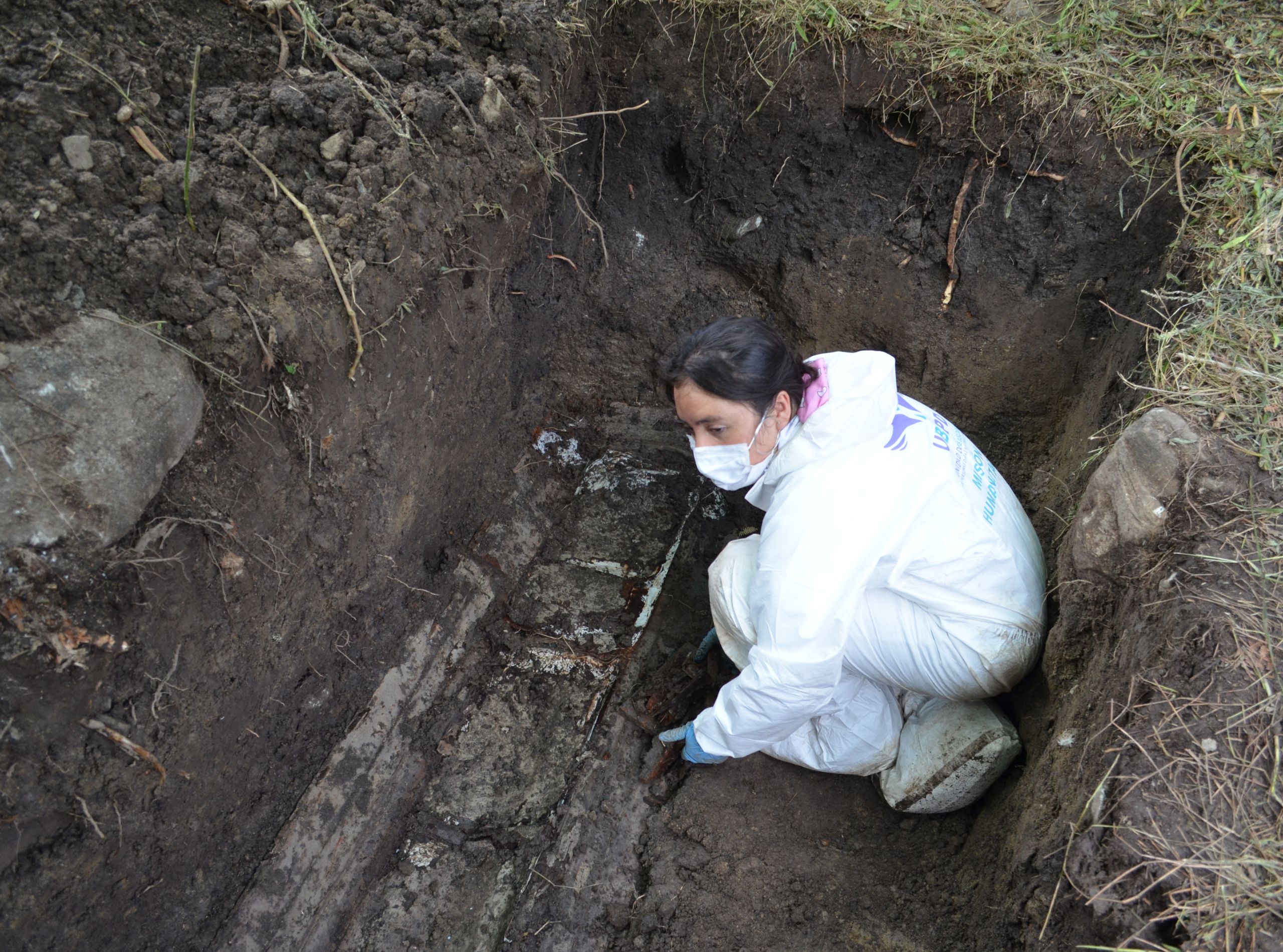 El equipo que intervino la tumba de Jehimy excavó hasta llegar a una profundidad de un poco más de metro y medio. Angie Katherine dio las indicaciones. Se formó un rectángulo de casi dos metros de largo por uno de ancho. La fosa tapaba a la antropóloga hasta las costillas. Se tuvo en cuenta la ubicación de las tumbas vecinas para que la zanja no cruzara sus límites. El clima de la tarde era fresco, el viento corría y la amenaza de lluvia se alejó. Sin embargo, en las cimas de las montañas que rodean el cementerio había neblina.